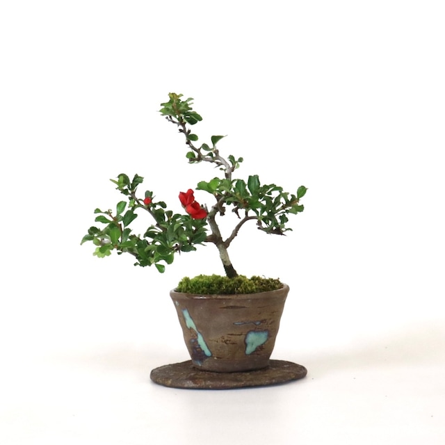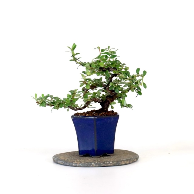 春には小さな白い花、 秋には紅葉し冬まで赤い実をつけます。 丈夫で育てやすいのも魅力。 一年を通して季節の移ろいを楽しめます。 水色の鉢に秋の紅葉、春の白花が映えます。 まだ若い樹ですが、しっかりと幹模様が入り、 これから育てていく楽しみな一鉢。 "カマツカコケモモ" バラ科シャリントウ属半常緑低木 高さ: 13㎝ (樹高 8㎝) 幅: 12㎝ 鉢:青藤色六角鉢 ※ご注文頂きましたら苔を貼って発送致します。 苔貼り不要の場合は備考蘭からお知らせください。 ※2025年8月撮影 ※一部針金がかかっています。 ※飾り板は付いていません -育て方のポイント- 【置き場所】 風通しの良い場所を好みます。 基本的には外の環境が適していますが、お家で飾りたい場合は、水やりの際に数時間外に置いてあげるなどしてお日様に当てる時間を作ってみて下さい。 夏の直射日光の強い日は日陰に置きましょう。 冬の寒さには比較的強いです。 【水やり】乾いたらたっぷり与えて下さい。 目安 春・秋 1日1回 夏 1日2回 冬 2.3日に1回 【肥料】春と秋にホームセンターで売ってる液肥(ハイポネックスなど)を規定量で薄めて、水やり代わりに与えると花がきやすいです。 -ご購入前に- ⚫︎お受け取り可能な日で配送日指定をお願い致します。生き物で傷みやすい為、最短配送時間で発送致します。 ⚫︎季節の変化により、撮影時の姿と多少異なる場合がございます。盆栽は樹の形を楽しむものではありますが、贈り物の場合など花や実の状態が知りたい場合、お気軽にお問い合わせ下さい。 ⚫︎盆栽が届きましたら、すぐに開封しお水を与えて下さい。ラッピングを致しますとお水をあげにくくなります。 贈り物用でご購入頂いた盆栽を、ご自身でお渡しする場合は、ラッピングの有無をご確認下さい。